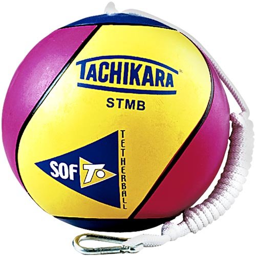 Tachikara STMB extra soft tetherball (gold/royal/scarlet). Tachikara STMB STMB Super Soft tetherball is manufactured with a special rubber composition cover designed to provide a unique "soft touch" resulting in a no-sting game. Nylon rope included that has with metal clip that attaches to the ball on a durable recessed metal post. Official size and weight (navy/red/gold)